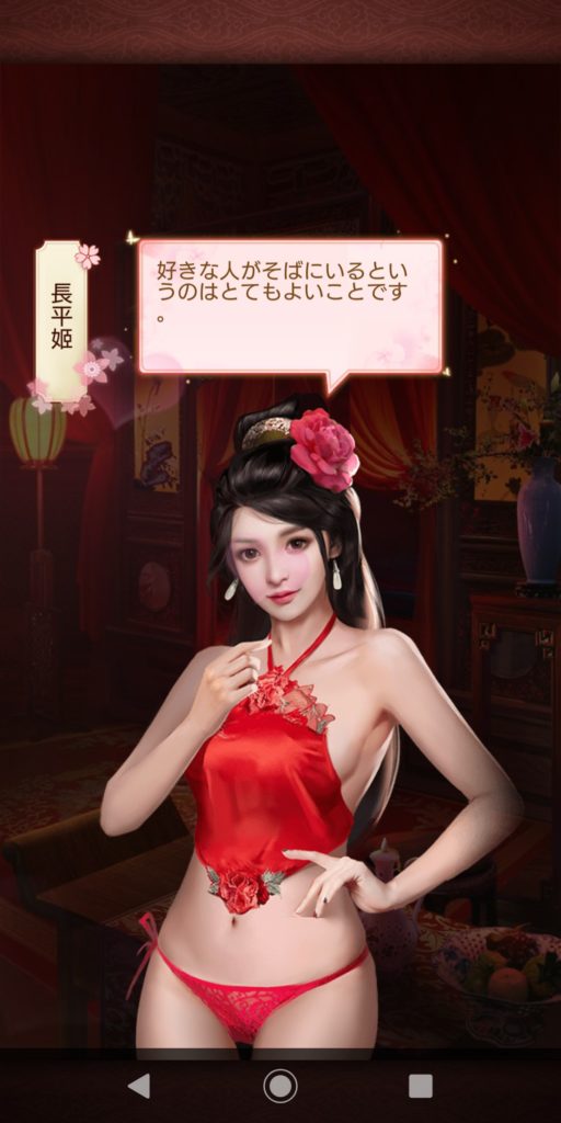 後は、寵愛など下部で説明しますが寵愛をすることで露出の多い美人の演出が見れるおいろけシーンを見れることができます。
