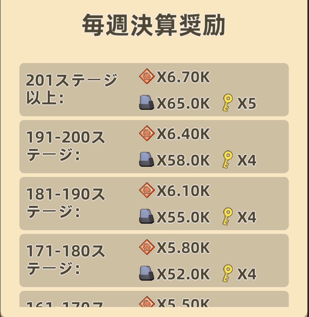 - 毎週、初回プレイ時には前週の最終成績の半分にあたるステージから挑むことができる。