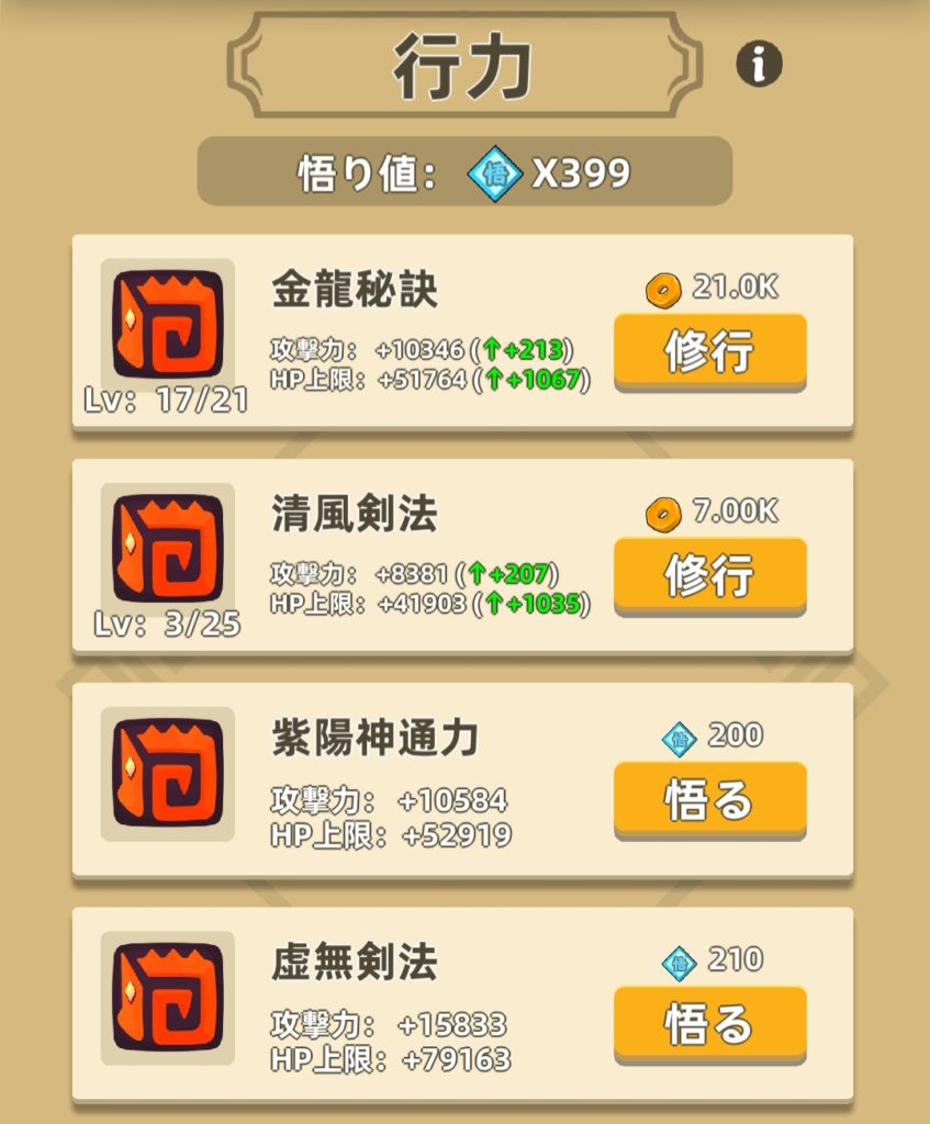 悟り値は使用することで行力を習得し、攻撃力やHPをアップさせることができます。