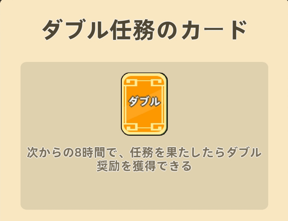 ダブル任務のカード同様、手に入れることのできるチャンスは少ないですが、他の2つのカードに比べて効果の発動時間が圧倒的に長いのが特徴です。