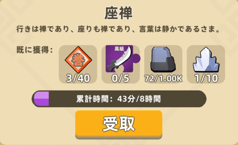 時間を長く置いておくほど最終的に受け取れる報酬は増えていくので、できれば最大の8時間になってから「受取」をタップすることがオススメです。