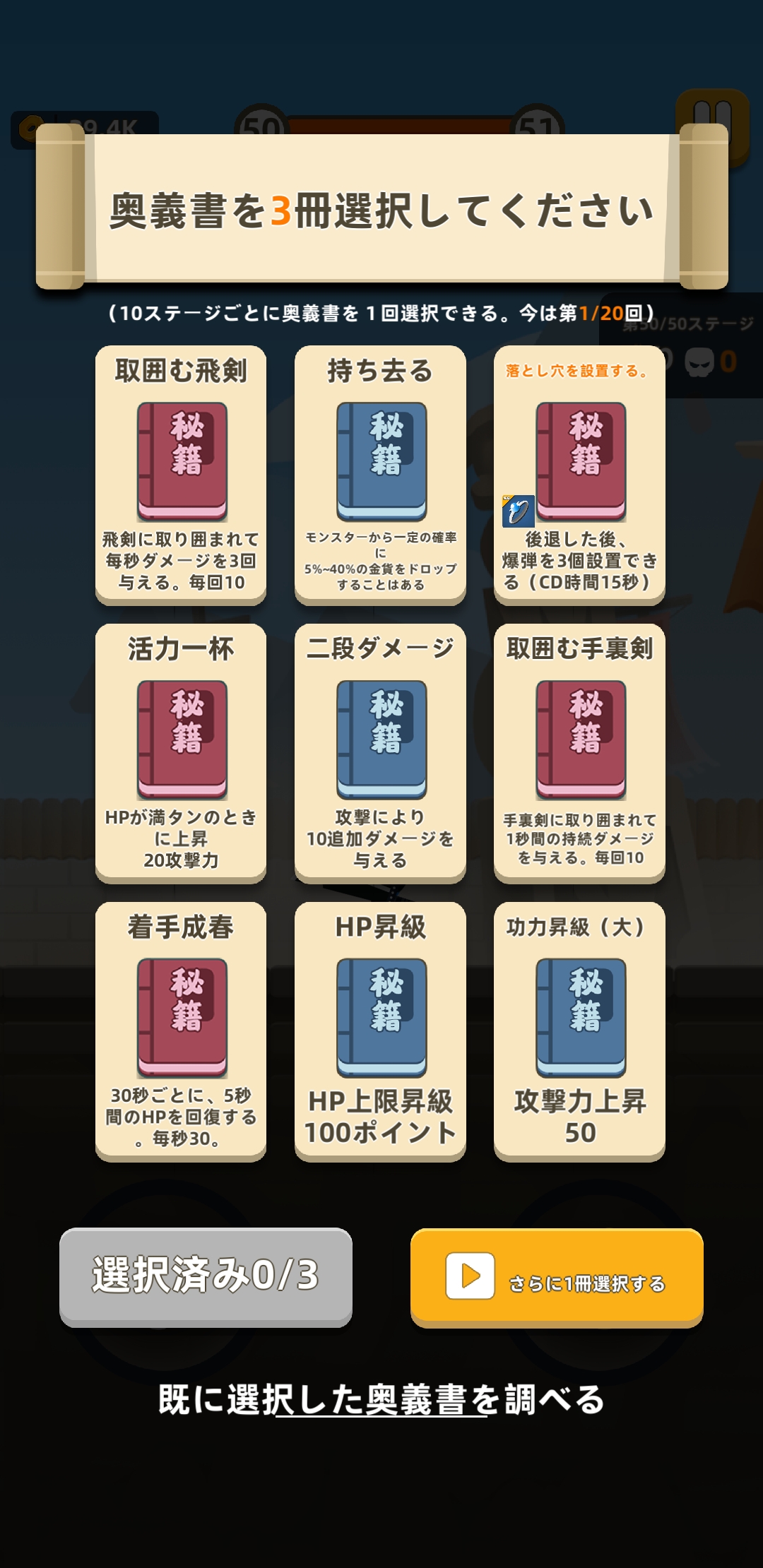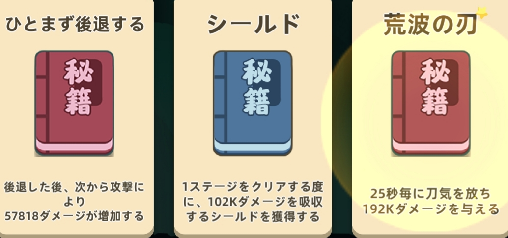 - 奥義書はレベルアップごとではなく、10ステージ踏破ごとに3つ選択できる。
