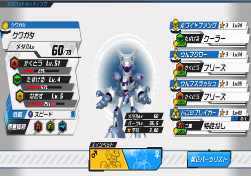 このメダルは格闘攻撃が得意なのと、性格がスピードなので、優先的に相手の腕パーツを狙い攻撃します。