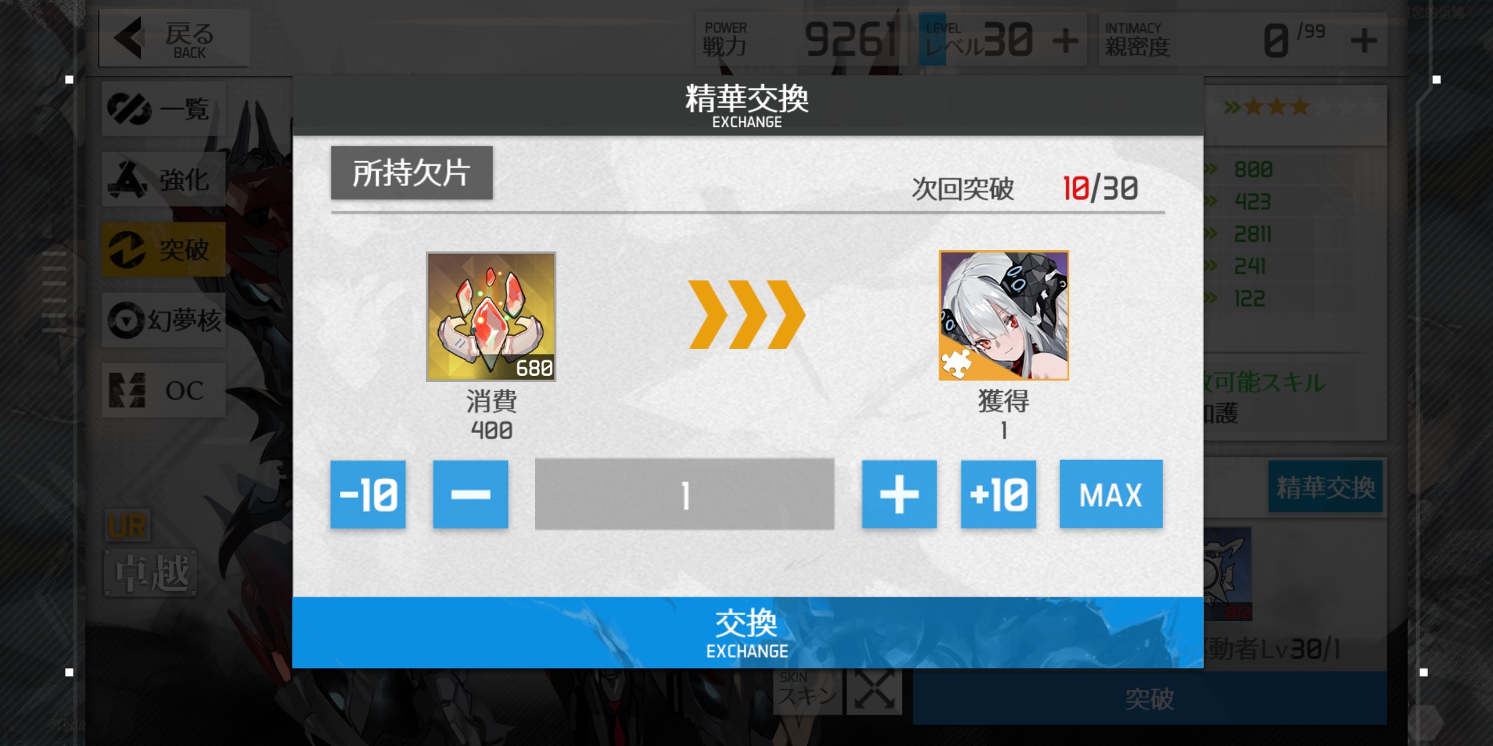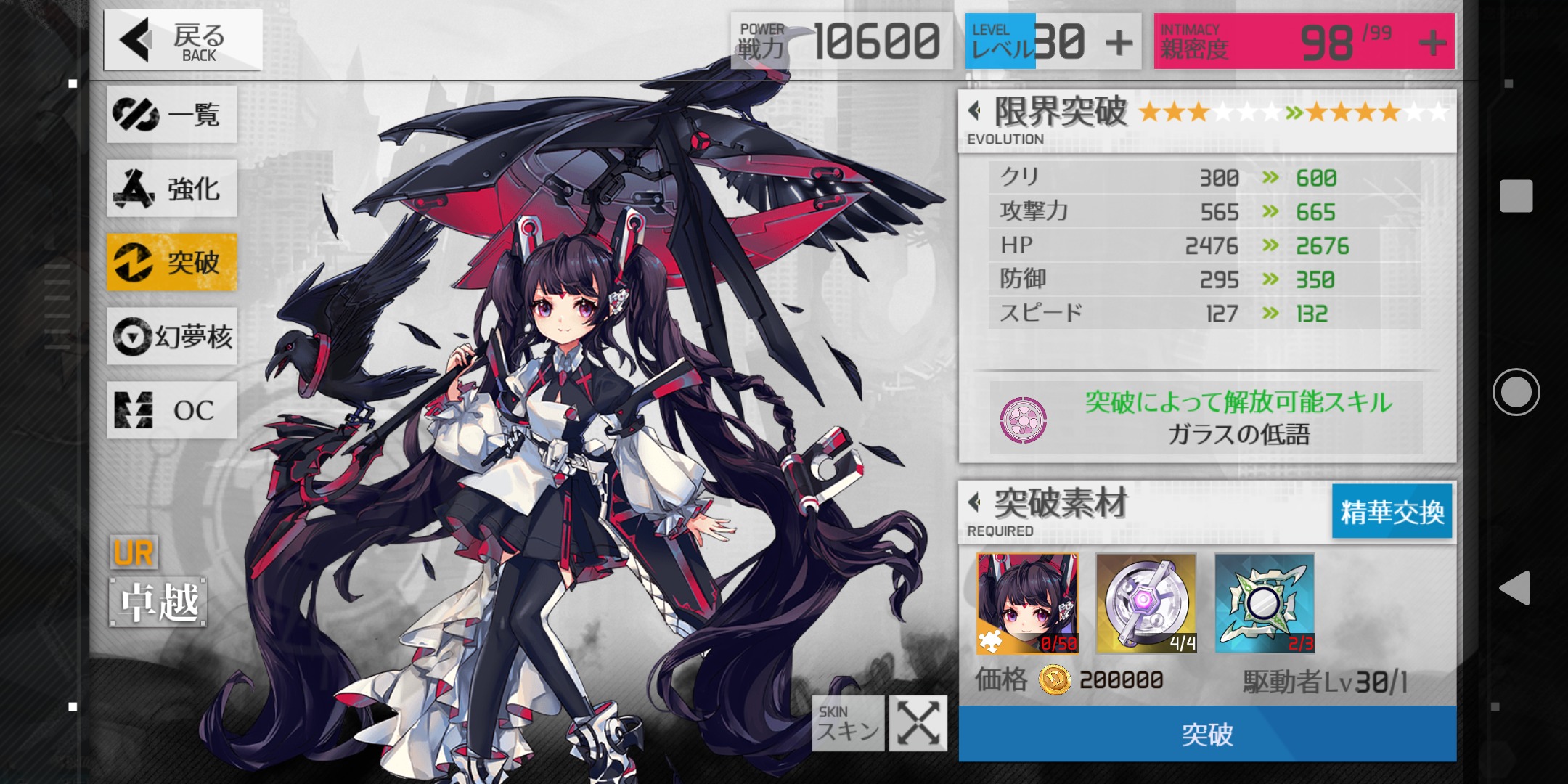 突破をするには素材が必要となり各キャラの欠片と各凸数に応じた駆動や核が必要となります。